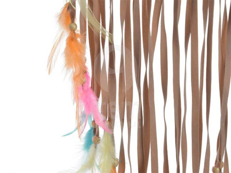 Este atrapasueños es de tamaño más bien grande, con 32x100 centímetros, cintas marrones con una pluma de color al final de cada una, entre los colores variados como naranja, rosa y verde.
