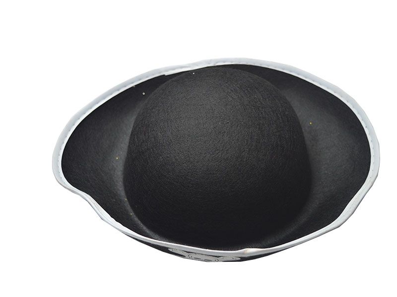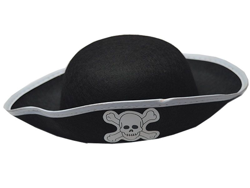 Gorro de pirata negro infantil con franjas blancas para complementar tu disfraz de pirata, tiene una pegatina blanca con el símbolo pirata en la parte delantera.