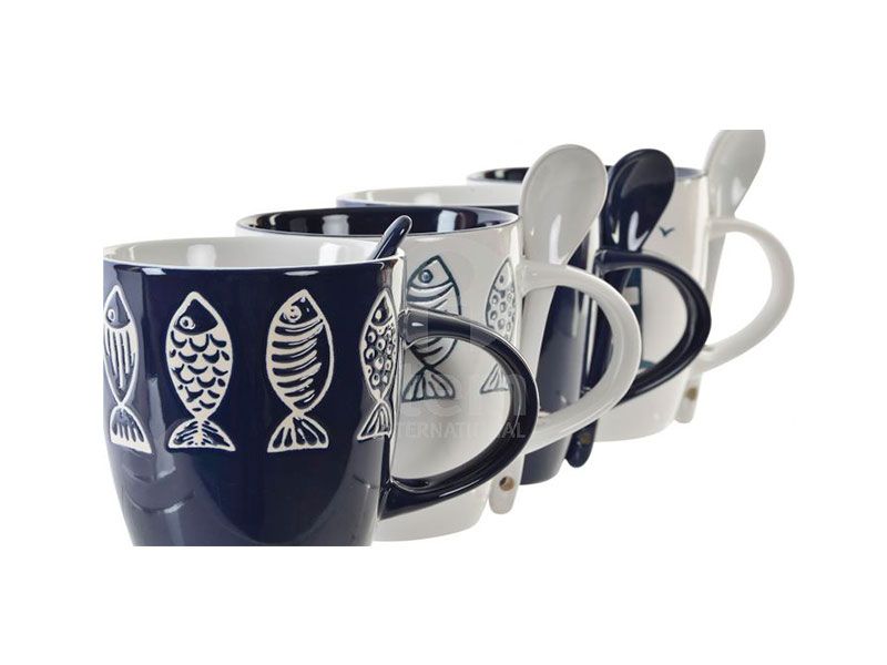 Taza o mug para tus desayunos o meriendas con una capacidad de 320 ml y fabricada en gres. Esta taza está disponible en 2 modelos y 2 colores cada modelo, con un estilo marino de un faro o decorado con peces y color azul marino o blanco puedes elegir esta taza que además tambíen incluye una cuchara fabricada en el mismo material que la taza.